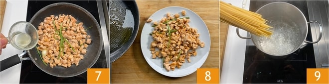 Cuando esté bien dorado, rociad el salmón con el jugo de limón 7 y cocinad 1-2 minutos más. Transferid los cubitos de salmón a un plato, escurriéndolos de la grasa de cocción y apartando la sartén, que servirá posteriormente para saltear la pasta; cubridlos con un plato para que no se sequen. Echad los espaguetis en el agua que habrá alcanzado el punto de ebullición 9 y cocinadlos la mitad de su tiempo de cocción.
