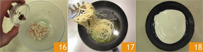 Mientras la pasta se cocina, prepara la salsa de Monte Veronese: vierte el queso rallado en una sartén antiadherente 13, añade la nata 14 y mezcla a fuego lento para que se derrita completamente. Una vez lista, reserva la salsa de Monte Veronese 15.