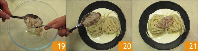 Con la ayuda de 2 cucharas, forma quenelles 19 y coloca la tártara en la parte superior del plato 20. ¡Tus espaguetis con salsa de Monte Veronese y tártara de lubina están listos para ser servidos 21!