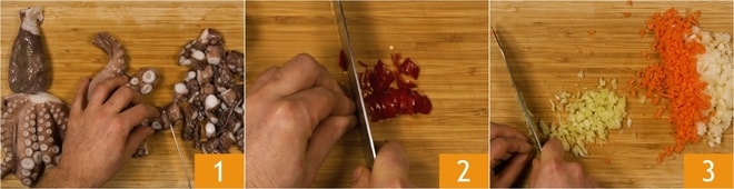 Para preparar los espaguetis con salsa de pulpo, primero cortad el pulpo en trozos de unos 2 cm 1, luego picad el chile 2. Limpiad y picad también la cebolla, la zanahoria y el apio 3.