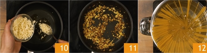 Mientras tanto, tostád la miga desmenuzada en una sartén con un poco de aceite 10 11. Hacia el final del tiempo de cocción de la salsa, llevad a ebullición una olla de agua con sal y coced los espaguetis 12.