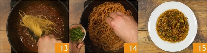 Escurrid la pasta muy al dente y terminad la cocción en la sartén con la salsa 13. Finalmente, aromatizad con el perejil picado 14 y mezclad bien todo. Servid los espaguetis con salsa de pulpo añadiendo la miga crujiente directamente en el plato 15!