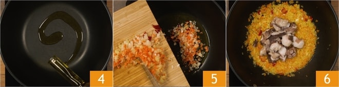 Calentad un chorrito de aceite en una sartén grande 4, añadid todo el picadillo 5 y sofreíd durante 4-5 minutos a fuego medio-bajo, luego incorporad el pulpo 6 y dejad que se dore.