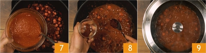 Cuando el agua liberada por el pulpo se haya evaporado, agregad la salsa de tomate 7 y el concentrado 8, mezclad bien y cubrid con la tapa 9. Cocinad durante más de una hora a fuego lento, agregando un poco de agua caliente si es necesario.