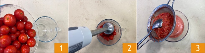 Para preparar los espaguetis con tomate fresco, albahaca y stracciatella, lava y luego tritura los tomatitos con una batidora de mano 1 2. Una vez obtenida una crema lisa, pásala por un colador de malla fina ayudándote con una cuchara 3. Reserva.