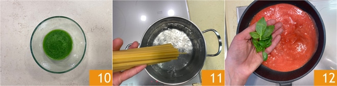 De esta manera obtendrás un aceite liso 10. Cocina los espaguetis al dente en agua hirviendo con sal al gusto 11. Mientras tanto, en una sartén (con el fuego apagado) vierte la salsa de tomate obtenida, sala y pimienta y añade unas hojas de albahaca 12.