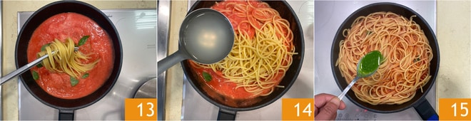 Escurre los espaguetis (reservando un poco de agua de cocción) en la sartén con el condimento 13 y solo entonces enciende el fuego. Termina la cocción de la pasta en la sartén agregando un cucharón de agua de cocción 14. Al final de la cocción añade el aceite de albahaca 15 y mezcla.