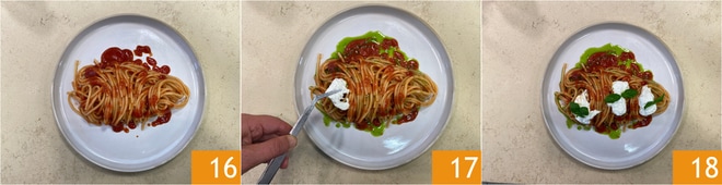 Emplata añadiendo más salsa de tomate 16, un hilo de aceite de albahaca y unos trozos de stracciatella 17. ¡Los espaguetis con tomate fresco, albahaca y stracciatella están listos para ser disfrutados 18!