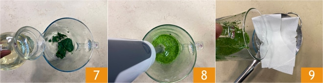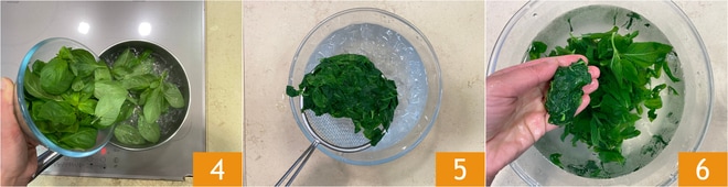 Pasa al aceite de albahaca: escalda las hojas durante 30 segundos en agua hirviendo 4, luego escúrrelas y ponlas en un bol con agua y hielo 5 para mantener su color brillante. Ahora estruja las hojas 6.