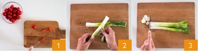 Para preparar los espaguetis de soja con almejas y tomates cherry, primero lava y corta en 4 partes los tomates cherry 1. Retira las capas externas de las cebolletas 2, elimina la base y córtalas en rodajas 3.
