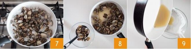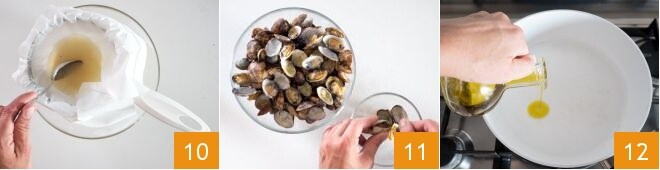 Coloca las almejas en una sartén, cúbrelas con la tapa y cocina a fuego alto durante unos 5 minutos, el tiempo necesario para que se abran las conchas 7. Utilizando una espumadera, transfiere las almejas a un cuenco 8. Toma un colador de malla fina y fórralo con papel absorbente o un paño delgado. Vierte el jugo en el colador 9,