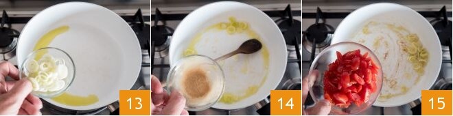 añade la cebolleta 13 y el jengibre 14 y deja dorar durante unos minutos a fuego moderado, luego añade los tomates cherry 15.