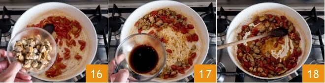 Agrega también las almejas sin concha 16 y rocía con 20 g de salsa de soja 17. Apaga el fuego y reserva 18.