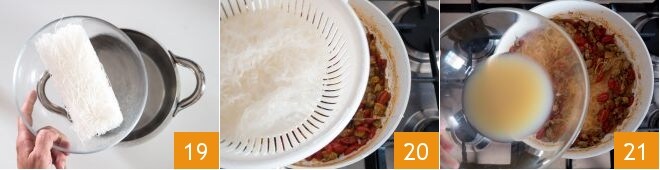 Vuelve a poner la cacerola con el agua a hervir, vierte aquí los espaguetis de soja, fuera del fuego 19, y deja en remojo durante unos 3 minutos. En este punto, escurre los espaguetis de soja directamente en la salsa 20, vierte el agua de cocción de las almejas 21