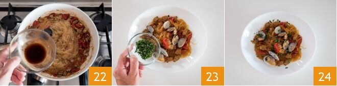 y la salsa de soja restante 22. Saltea en la sartén un par de minutos más y apaga el fuego. Sirve, completa con el perejil picado 23 y sirve de inmediato los espaguetis de soja con almejas y tomates cherry 24.