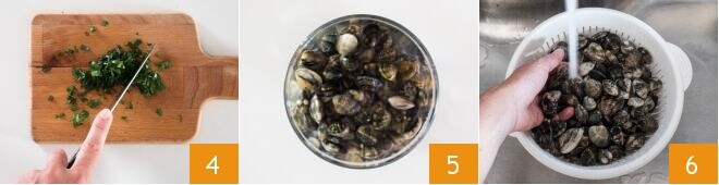 Pica el perejil 4 y resérvalo. Ahora limpia las almejas: primero selecciona las almejas, eliminando las abiertas o rotas. Luego golpea cada almeja sobre una superficie o una tabla de cortar para que pierdan un poco de arena e impurezas. Coloca las almejas en un cuenco lleno de agua 5 y déjalas en remojo durante un par de horas, cambiando el agua varias veces, hasta que no haya más residuos de arena en el fondo del cuenco. Luego enjuágalas una última vez bajo el agua corriente 6.