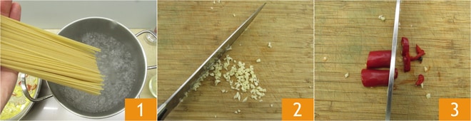 Para preparar los espaguetis con ajo, aceite y guindilla fáciles, primero poned al fuego una olla llena de agua, sal y cuando hierva, echad los espaguetis 1. Limpiad y picad el ajo eliminando el corazón 2, picad también la guindilla 3.