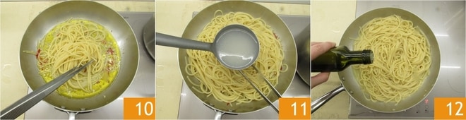 Cuando la pasta esté al dente, escurridla directamente en la sartén 10. Verted un cucharón de agua de cocción 11, dejad absorber para completar la cocción y luego mezclad con unos 40 g de aceite 12. Saltead brevemente los espaguetis. Cuando la mezcla esté casi lista, si es necesario, ajustad con sal fina.