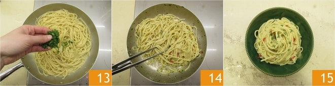 Condimentad con el perejil picado 13, mezclad 14 y servid los espaguetis con ajo, aceite y guindilla bien calientes 15.