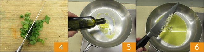Separad los tallos del perejil y picad las hojas 4. Mientras tanto, en una sartén muy amplia añadid 20 g de aceite 5, el ajo picado 6 muy finamente.