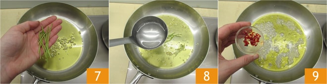 Incorporad también los tallos de perejil 7. Dejad pochar añadiendo un cucharón de agua de cocción 8. Luego añadid la guindilla fresca picada 9 y dejad que tome sabor. Eliminad entonces los tallos del perejil.