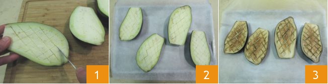 Para preparar los espaguetis integrales con berenjenas asadas y menta, primero cortad las berenjenas por la mitad a lo largo e haced cortes en la pulpa con un cuchillo formando un dibujo de rejilla, sin llegar hasta la piel 1. Colocad las berenjenas en una bandeja forrada con papel de horno con la parte cortada hacia arriba 2 y hornead en horno ventilado precalentado a 210° durante 40 minutos 3.