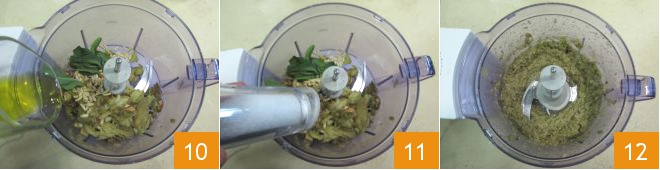 Incorporad también el aceite 10, la sal 11 y la pimienta y triturad hasta obtener una textura homogénea 12.