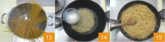 En ese momento el agua estará hirviendo, así que coced los espaguetis el tiempo indicado en el paquete 13. Verted la crema de berenjenas en una sartén, diluidla con un cucharón de agua de cocción de la pasta 14 y calentad a fuego bajo. Cuando la pasta esté al dente, escurridla directamente en la sartén y mezclad a fuego medio para integrar todo 15.