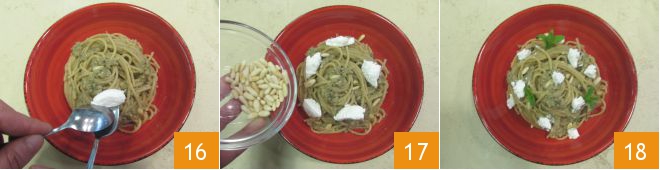 Tras emplatar, rematad cada plato con unos copos de ricotta 16, los piñones restantes 17 y algunas hojitas de menta: ¡vuestros espaguetis integrales con berenjenas asadas y menta están listos para servir 18!