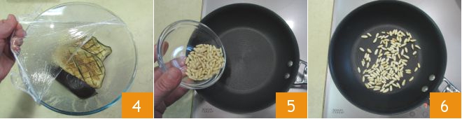Pasad las berenjenas cocidas a un bol, cubrid con film transparente 4 y dejad reposar 5 minutos: el vapor hará más fácil separar la pulpa de la piel. Mientras tanto, poned a hervir una olla con el agua que servirá para cocer la pasta y echad los piñones en una sartén antiadherente bien caliente 5: tostádlos durante unos 5 minutos, removiendo con frecuencia 6, y luego reservadlos.