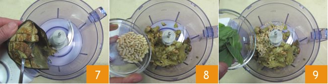 Sacad la pulpa de las berenjenas con la ayuda de una cuchara y vertedla en un vaso de batidora 7, luego añadid aproximadamente la mitad de los piñones tostados 8 y 6 hojas de menta 9.