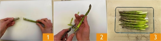 Para preparar espárragos a la sartén, comenzad con la Cómo limpiar los espárragos: lavadlos bien, luego rompedlos con las manos para eliminar la parte más clara y coriácea del tallo, manteniéndoos ligeramente más abajo del punto donde el espárrago tiende a doblarse 1. Con un pelador, pelad luego la parte final del espárrago 2. Recogedlos poco a poco en un bol y proceded de esta manera con todos los demás 3.