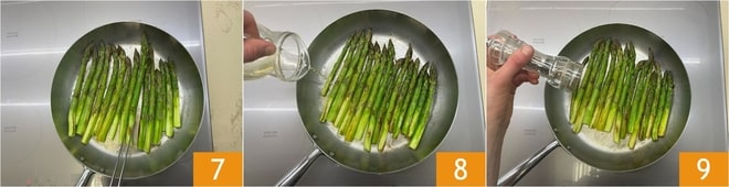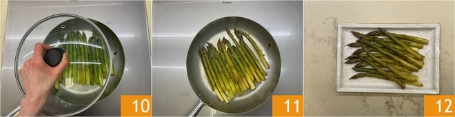 Cubrid con una tapa 10 y bajad ligeramente el fuego. Cocinad durante unos 20 minutos hasta que estén tiernos 11, ¡luego servid vuestros espárragos a la sartén 12!