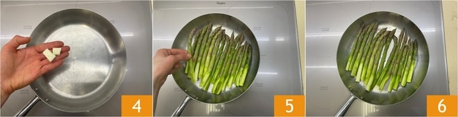 En una sartén, verted una nuez de mantequilla 4 y dejad que se derrita. Colocad dentro los espárragos sin superponerlos 5 y doradlos a fuego medio-alto durante 4-5 minutos 6.