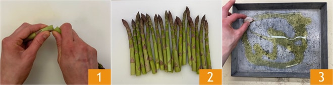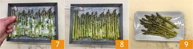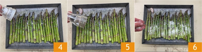 Coloca los espárragos uno al lado del otro, sin superponerlos, luego condimenta con sal 4, pimienta 5, Parmigiano Reggiano DOP rallado 6 y un poco más de aceite.