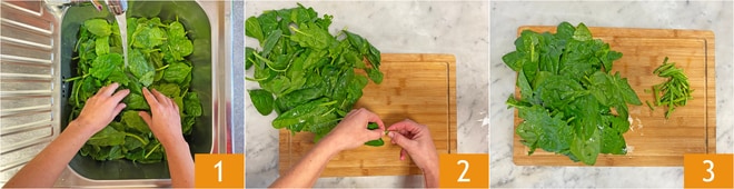 Para preparar las espinacas a la sartén, primero lava las hojas de espinaca 1. Retira la parte más dura del tallo de las espinacas 2 3.