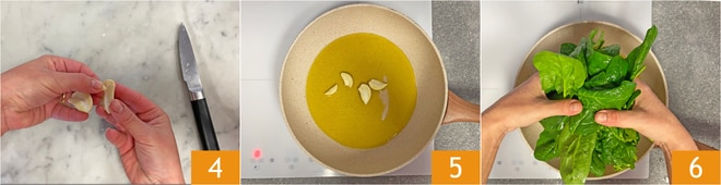 Pela los dientes de ajo, córtalos por la mitad y quítales el germen interno 4. Vierte el aceite de oliva virgen extra en una sartén grande junto con los dientes de ajo y calienta a fuego moderado 5. Ahora añade las espinacas lavadas 6.