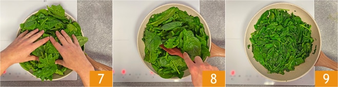 Échalas todas en la sartén aunque sean muy voluminosas 7, en poco tiempo se marchitarán. Tapa con la tapa y deja cocinar durante 5 minutos a fuego alto. Retira la tapa, sala, añade pimienta y mezcla con una espátula 8. Continúa la cocción a fuego medio durante 10 minutos más hasta que las espinacas a la sartén estén cocidas 9.