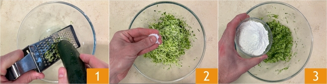 Para preparar las espirales de calabacín con ricotta y tomates secos, primero lavad y cortad los extremos de los calabacines, luego ralladlos en un bol 1. Echad sal 2, mezclad y dejad reposar durante 10 minutos, cubiertos con film transparente. Pasado este tiempo, los calabacines habrán soltado parte del líquido de vegetación, que servirá para obtener la consistencia adecuada de la masa. Entonces, añadid la harina 3.