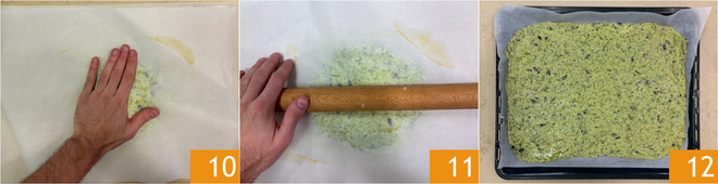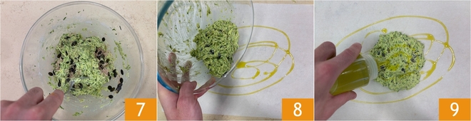 Mezclad todo 7 para formar un compuesto homogéneo. Verted el compuesto sobre un papel de horno ligeramente aceitado 8, luego aceitad también la superficie 9.