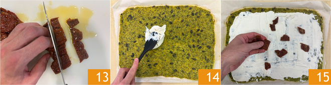 Mientras tanto, cortad los tomates secos en trozos pequeños 13. Una vez que la masa esté fría, untad la ricotta por toda la superficie 14, luego añadid los tomates secos 15.
