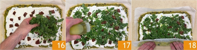 Finalmente, distribuid la rúcula previamente lavada y secada 16. Condimentad con una pizca de sal y un chorrito de aceite 17. Enrollad con cuidado la masa desde el lado largo ayudándoos con el papel de horno 18.