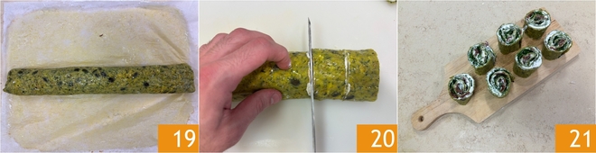 Cuando hayáis obtenido un rollo compacto 19, cortadlo en rodajas de 3-4 cm de grosor 20. ¡Vuestras espirales de calabacín con ricotta y tomates secos están listas para ser servidas 21!