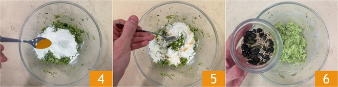 Añadid también la cúrcuma 4 y mezclad bien 5, luego incorporad las semillas 6.