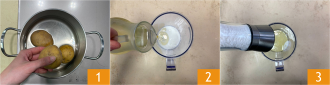 Para preparar las espirales de patata, primero cuece las patatas comenzando con agua fría, durante unos 30-40 minutos hasta que estén blandas 1. Mientras tanto, prepara la mayonesa con los pimientos secos: en una jarra vierte la leche y el aceite de girasol frío 2, luego añade sal 3.