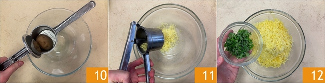 Escurre las patatas cocidas, presiona aún calientes con el prensapatatas 10 y recoge el puré en un bol 11. Sazona con las hojitas de mejorana fresca 12.