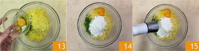 Añade el huevo entero 13 y la yema, luego vierte la harina 14 y sala 15.
