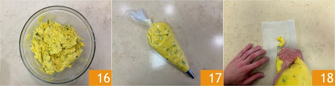 Mezcla la masa hasta que esté homogénea 16, luego transfiérela a una manga pastelera con boquilla de 12 o 13 mm 17. Corta cuadraditos de papel de horno de 10x10 cm y exprime la masa desde el centro 18.