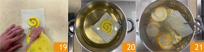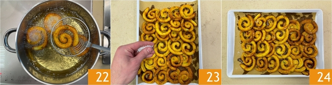 Debes formar espirales 19. Calienta el aceite de girasol en un cazo y, una vez alcance los 180°, sumerge los cuadrados de papel con las espirales 20, luego con unas pinzas elimina el papel 21. Fríe pocos a la vez para evitar que baje la temperatura del aceite.