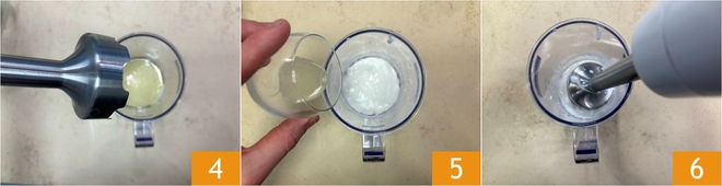 Sumerge la batidora de mano 4 y bate a velocidad media hasta que la mezcla se haya espesado. En este punto, añade el zumo de limón 5 y bate de nuevo durante unos segundos 6.
